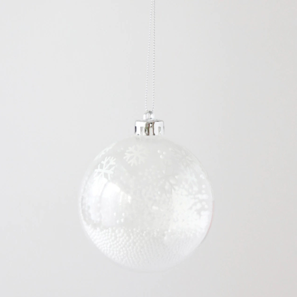 Un detalle sutil que eleva cualquier decoración navideña. Esta esfera de acrilico transparente, decorada con delicados copos plateados y rellena de pequeñas perlas blancas, aporta brillo y elegancia a tu árbol o a cualquier rincón del hogar. Su diseño minimalista combina con todos los estilos, desde los más clásicos hasta los más modernos.