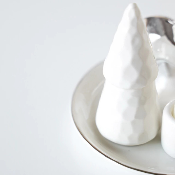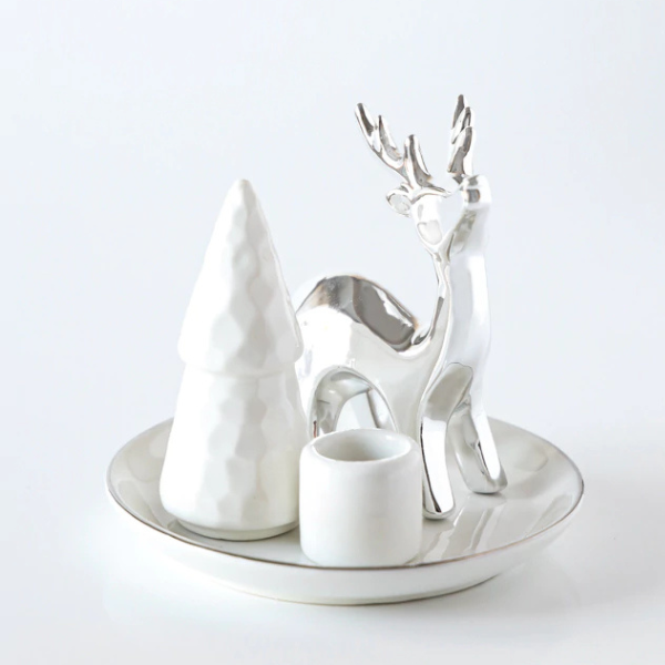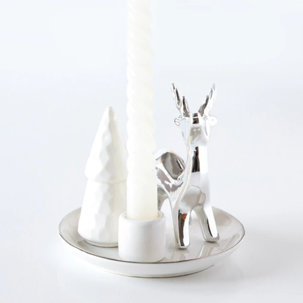 Un detalle que ilumina con estilo. Este portavela de cerámica combina un diseño delicado con un toque festivo: un reno plateado y un pino blanco sobre una base circular, creando una escena navideña moderna y sofisticada. Ideal para decorar mesas, estantes o regalar en las fiestas.