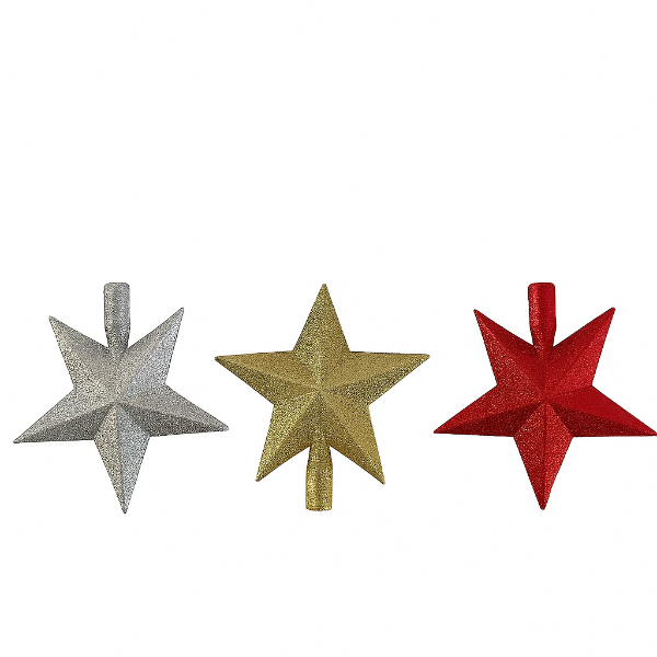 Iluminá tu árbol con un toque de brillo y elegancia con estas estrellas navideñas de 20 cm. Disponibles en tres colores clásicos —dorado, plateado y rojo—, aportan un acabado festivo y sofisticado a la punta del árbol o a cualquier rincón decorativo.