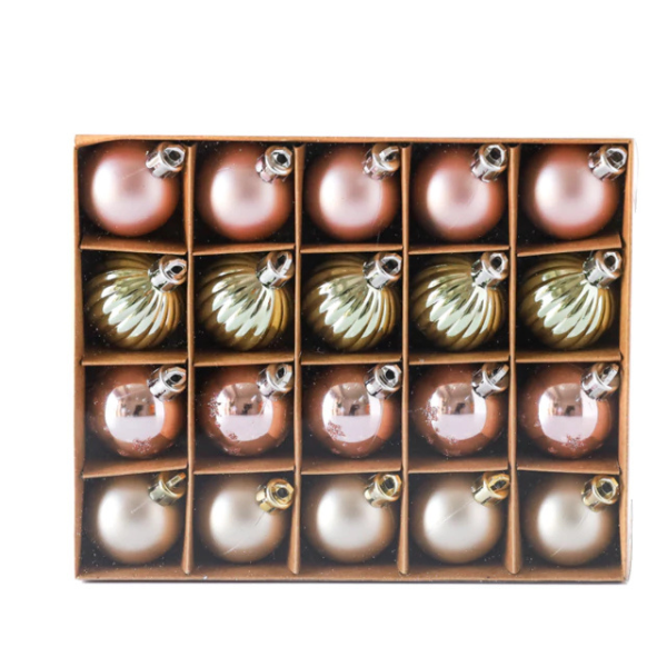 Elegancia en formato mini. Este set incluye 20 esferas navideñas de 4 cm con una paleta sofisticada en tonos rosa, dorado y cobre. Combina acabados brillantes, mate y texturados que aportan profundidad y reflejos sutiles al árbol o a cualquier rincón festivo. Perfectas para árboles medianos, guirnaldas o centros de mesa con estilo moderno y cálido.