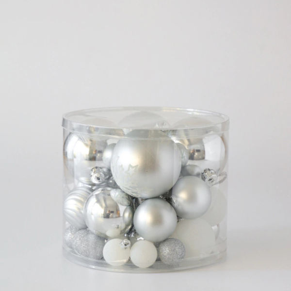 Set de 35 Esferas Navideñas Plata y Blanco – Diferentes Tamaños